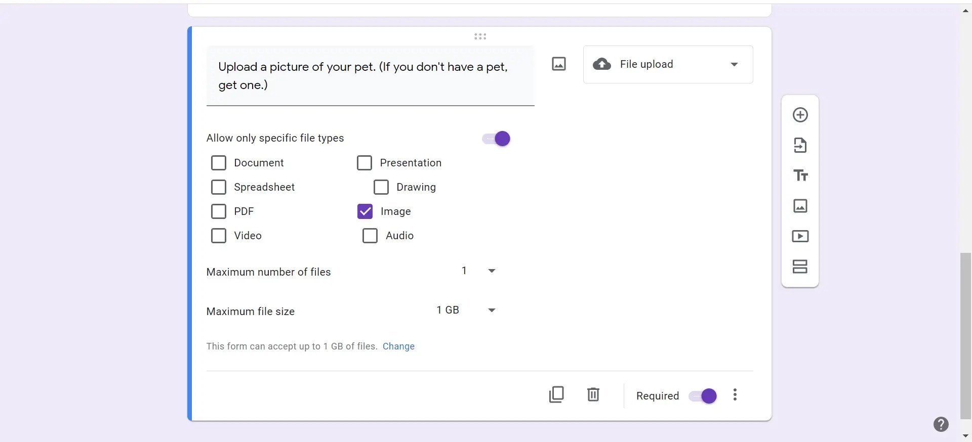 Adding the file upload button to your google form · when creating a new google form, you will have the ability to add questions with several . Uploaded files storage and ownership transfer to google form creator · a copy of the file is uploaded to the google form by a respondent · the . Settings · open your google form, click on add question and select file upload. · a confirmation message will be displayed. To add a file upload question, choose '+' and then use the dropdown to find 'file upload'.